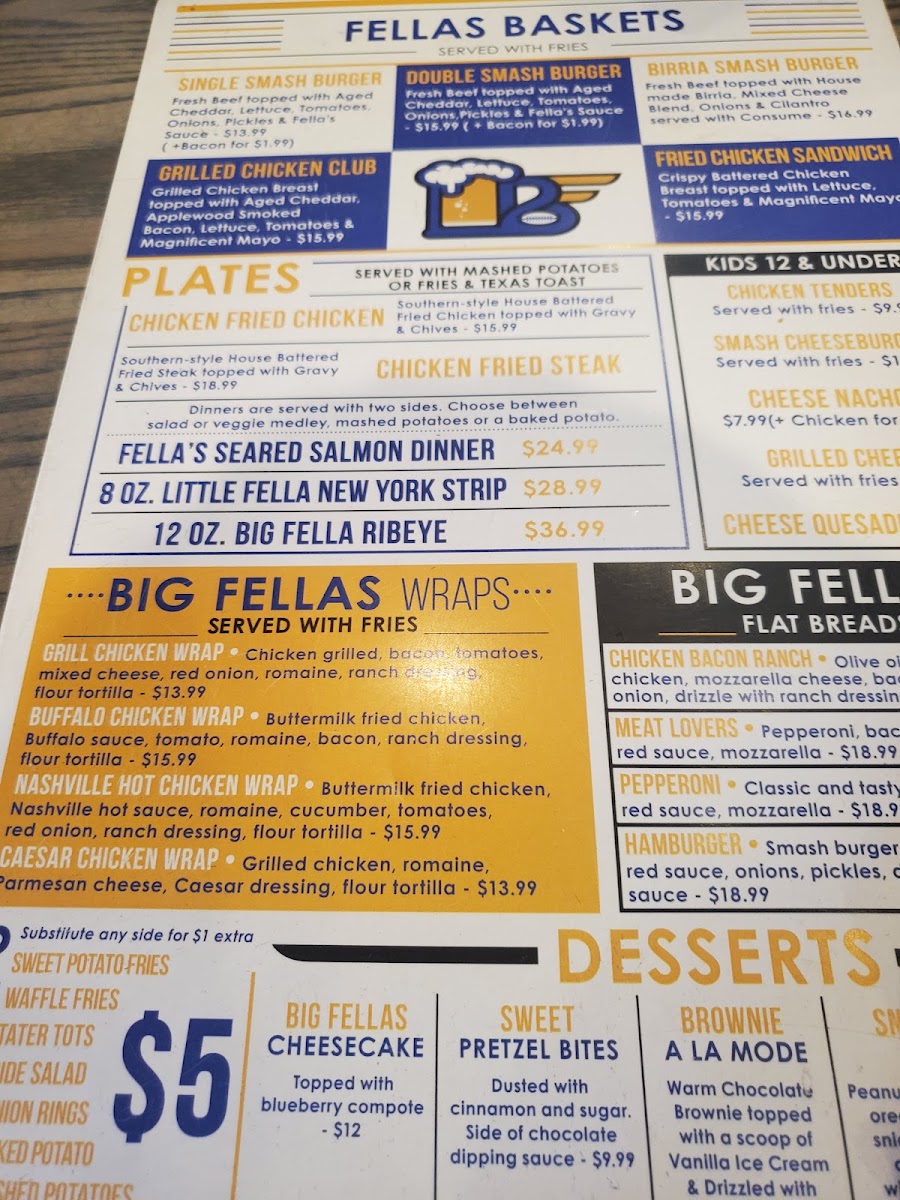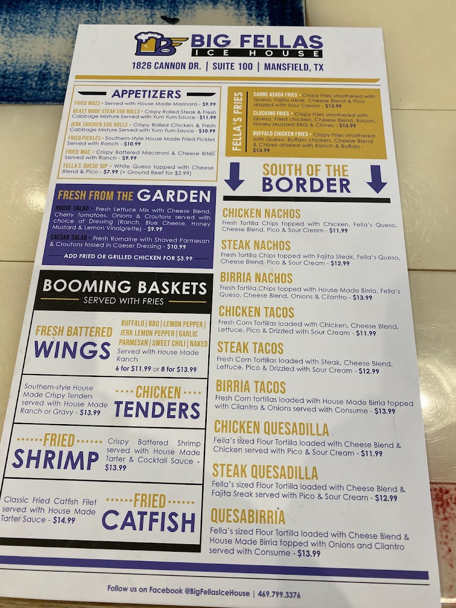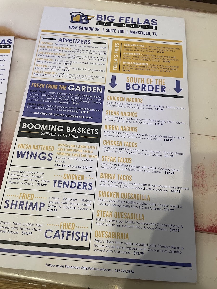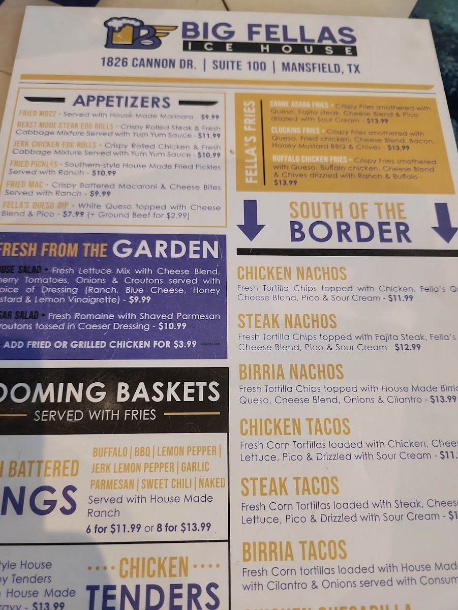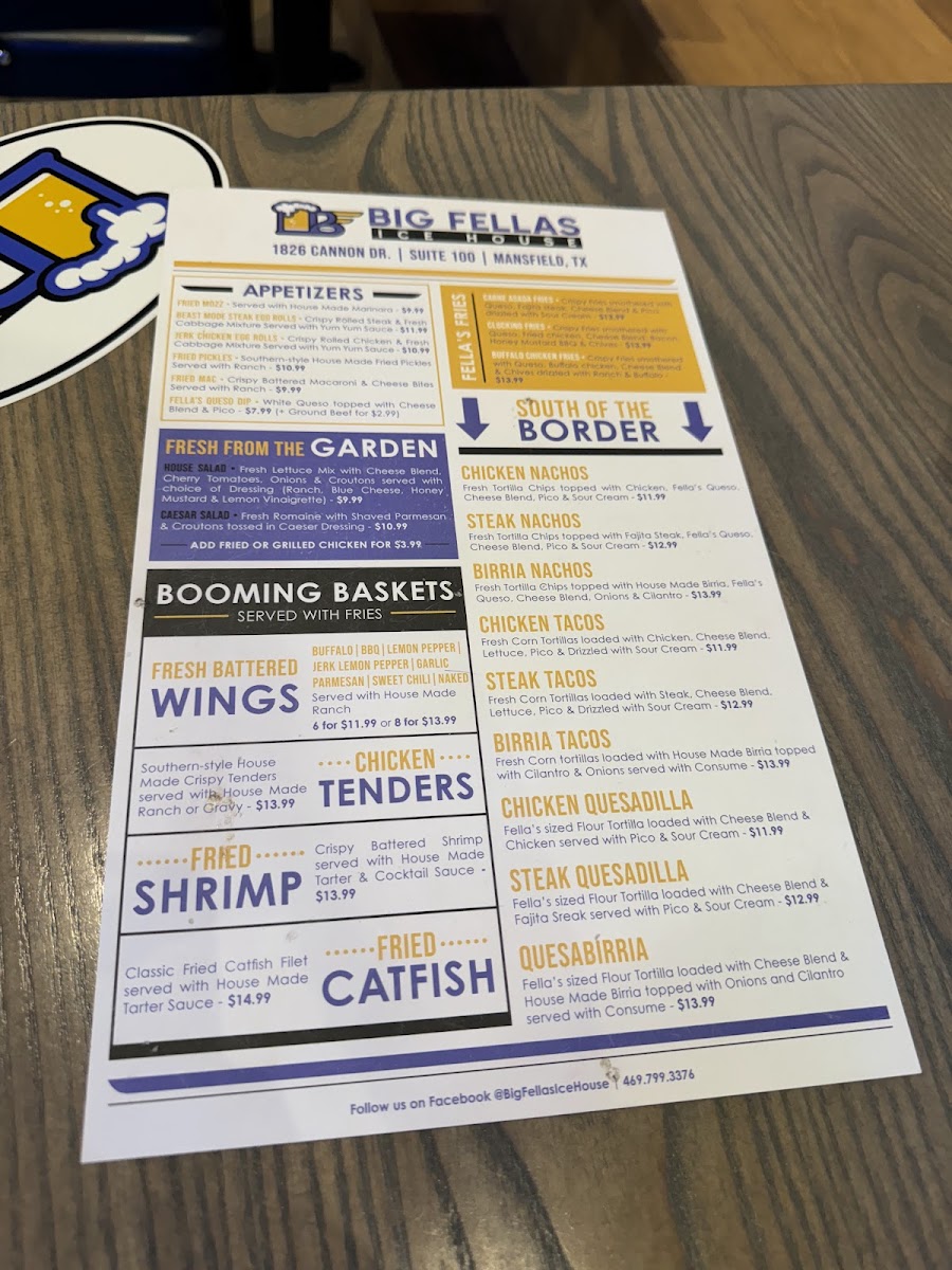 The menu at Big Fellas Ice House offers a wide variety of delicious options, making it an ideal spot for any craving. Start off with tasty appetizers like Pretzel Bites, Jerk Chicken Egg Rolls, and Fried Pickles or dive into their signature Fella's Queso Dip. For something heartier, try the Buffalo Chicken Fries or Carne Asada Fries from the Fella's Fries selection. Fresh salads like the House Salad or Caesar Salad, with options to add chicken, provide a light option. The "Booming Baskets" section shines with favorites like the BIG FELLAS Seafood Combo featuring shrimp and catfish, or the crispy Fried Shrimp and Chicken Tenders. Brunch lovers can indulge in Chilaquiles or Breakfast Tacos, while the Breakfast Wrap and Classic Egg Sandwich offer a satisfying start to the day. For a lighter bite, the Caesar Chicken Wrap and Buffalo Chicken Wrap are popular picks. The "Banging Baskets" feature juicy burgers such as the Birria Smashburger and Grilled Chicken Club, along with a delicious Fried Chicken Sandwich. South of the Border, enjoy the flavorful Steak Nachos or Chicken Quesadilla, while kids can savor favorites like Smash Cheeseburgers and Grilled Cheese. Sides like Tater Tots, Waffle Fries, and Onion Rings complement any meal perfectly. Finish with indulgent desserts like the rich Snickers Pie or Big Fellas Cheesecake with Blueberries. For heartier plates, the Chicken Fried Chicken and Fellas Seared Salmon are standout options, while the Big Fella Ribeye and Little Fella NY Strip Steak promise a satisfying steak experience. Whether you're here for a quick snack, a hearty meal, or a sweet treat, Big Fellas Ice House delivers on all fronts.
