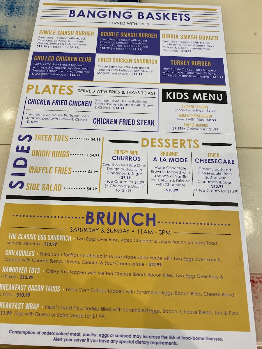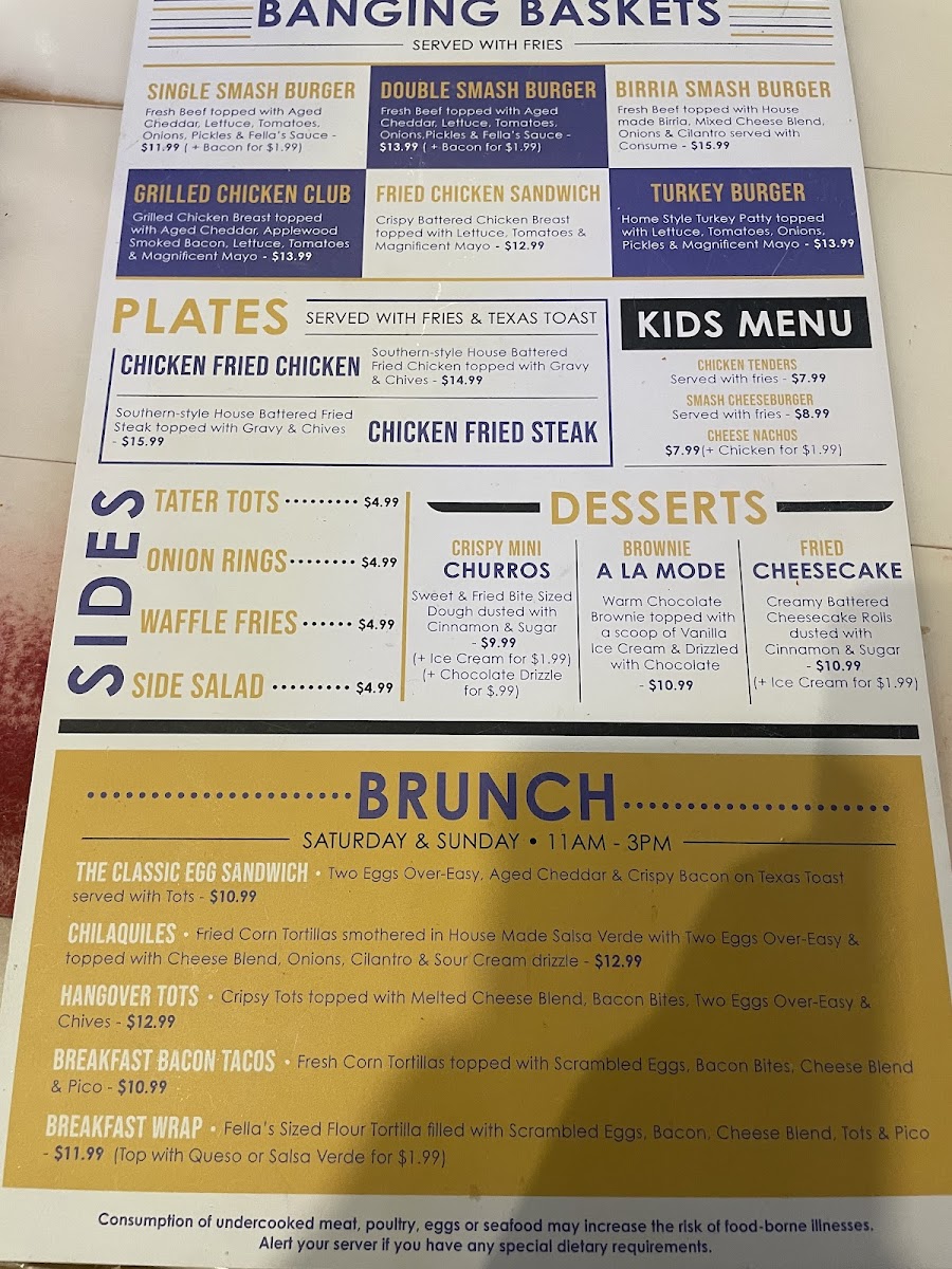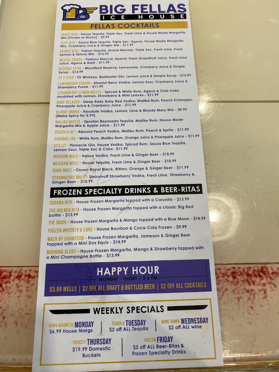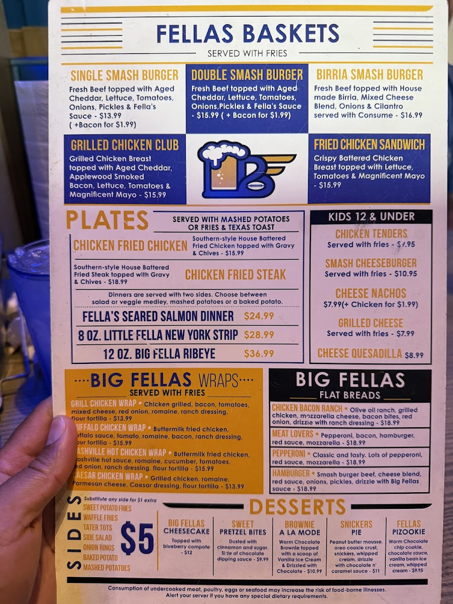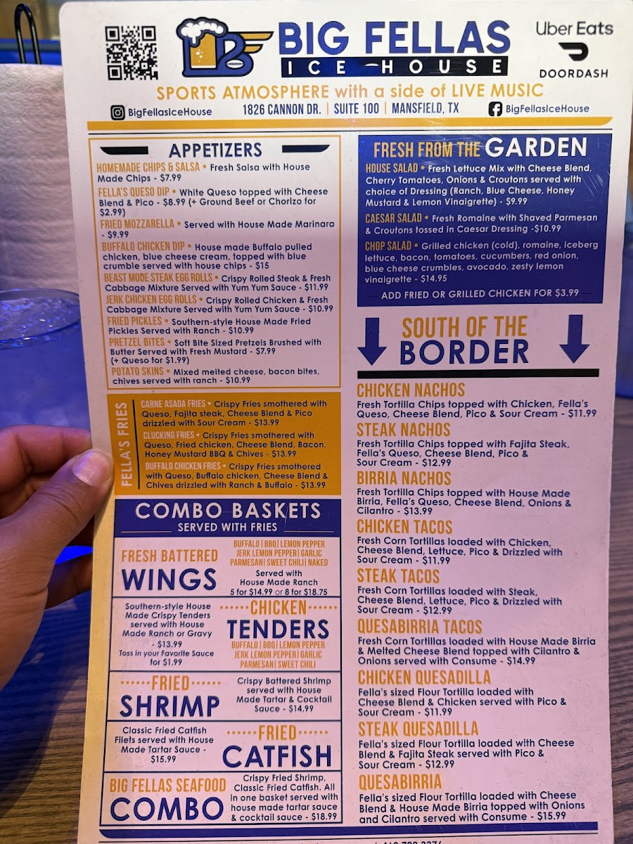 The menu at Big Fellas Ice House offers a wide variety of delicious options, making it an ideal spot for any craving. Start off with tasty appetizers like Pretzel Bites, Jerk Chicken Egg Rolls, and Fried Pickles or dive into their signature Fella's Queso Dip. For something heartier, try the Buffalo Chicken Fries or Carne Asada Fries from the Fella's Fries selection. Fresh salads like the House Salad or Caesar Salad, with options to add chicken, provide a light option. The "Booming Baskets" section shines with favorites like the BIG FELLAS Seafood Combo featuring shrimp and catfish, or the crispy Fried Shrimp and Chicken Tenders. Brunch lovers can indulge in Chilaquiles or Breakfast Tacos, while the Breakfast Wrap and Classic Egg Sandwich offer a satisfying start to the day. For a lighter bite, the Caesar Chicken Wrap and Buffalo Chicken Wrap are popular picks. The "Banging Baskets" feature juicy burgers such as the Birria Smashburger and Grilled Chicken Club, along with a delicious Fried Chicken Sandwich. South of the Border, enjoy the flavorful Steak Nachos or Chicken Quesadilla, while kids can savor favorites like Smash Cheeseburgers and Grilled Cheese. Sides like Tater Tots, Waffle Fries, and Onion Rings complement any meal perfectly. Finish with indulgent desserts like the rich Snickers Pie or Big Fellas Cheesecake with Blueberries. For heartier plates, the Chicken Fried Chicken and Fellas Seared Salmon are standout options, while the Big Fella Ribeye and Little Fella NY Strip Steak promise a satisfying steak experience. Whether you're here for a quick snack, a hearty meal, or a sweet treat, Big Fellas Ice House delivers on all fronts.